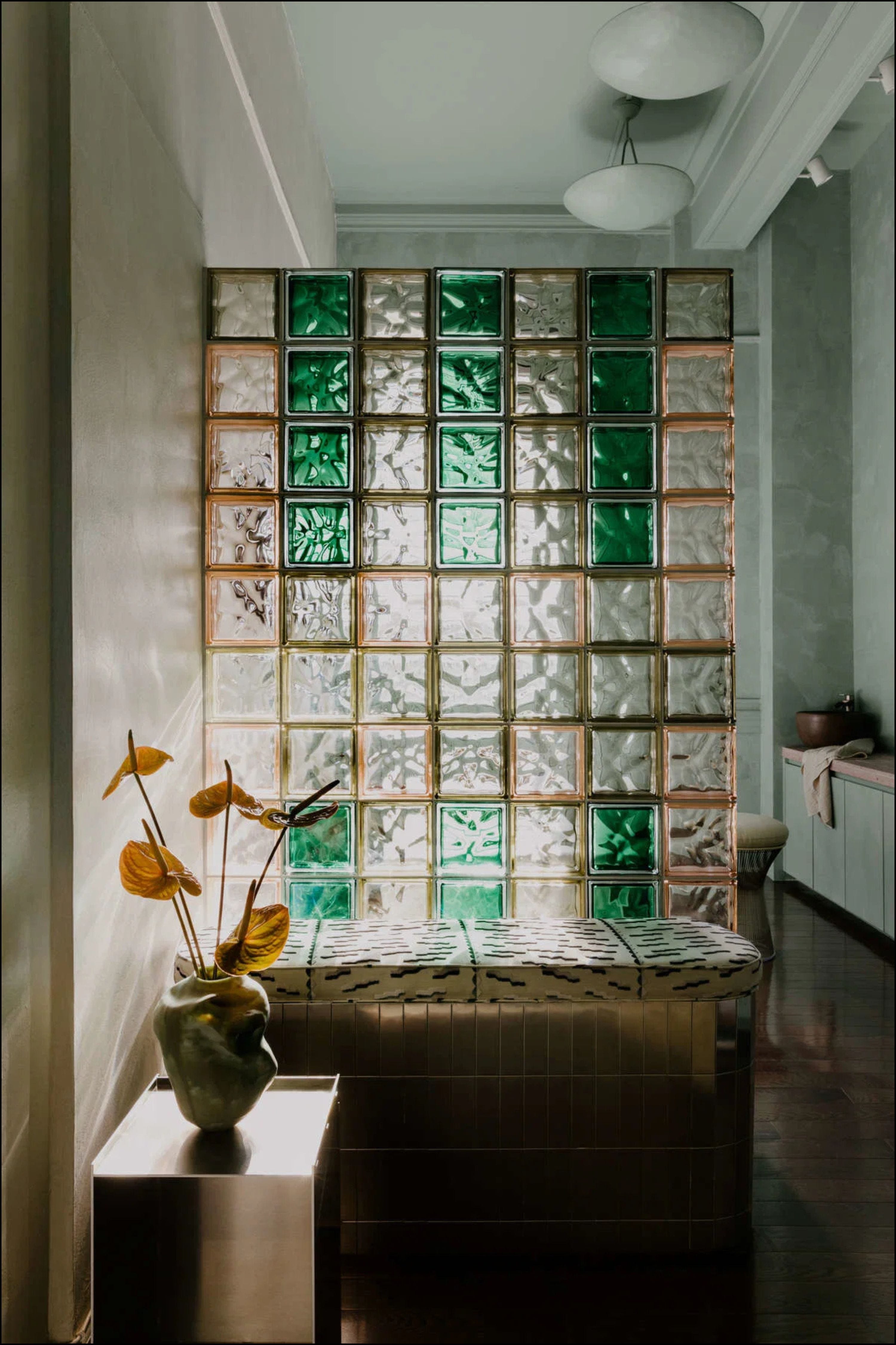 The jewel box of a studio is grounded by blues, greens, and volcanic cantera stone. It’s refreshing in a world where wellness spaces are usually bright white and wood filled.